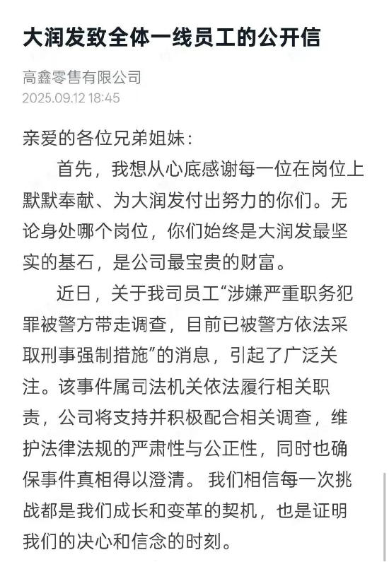 9月中旬,大润发对外公布,营运长管明武涉嫌严重违法违纪被带走。其回应称,目前该案件正在调查阶段,一切以公安机关公布的信息和调查结果为准。大润发还强调,公司一直秉持合法合规经营理念,对违法违规零容忍。