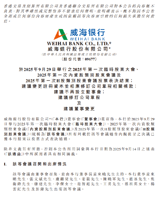 9月29日金融一线消息,威海银行今日发布公告称,该行于9月29日举行2025年之一次临时股东大会、2025年之一次内资股类别股东会议及2025年之一次H股类别股东会议,会议所有议案均获威海银行股东以投票方式表决通过,其中就包括威海银行30亿元资本补充计划。