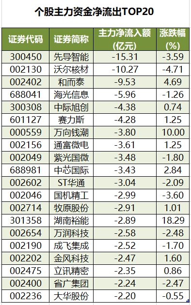 今日有3083只个股被主力资金净卖出,其中,96股被主力资金净卖出超1亿元。主力资金净流出最多的个股是,净流出金额为15.31亿元;主力资金净流出居前的个股还有、、、、等,净流出金额分别为10.27亿元、9.53亿元、5.96亿元、4.38亿元、4.28亿元。