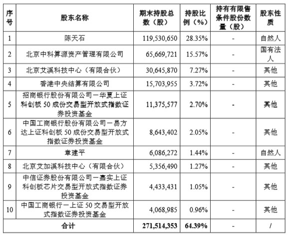 公告显示,本次定增后,寒武纪前十大股东的位次没有发生变化,仅持股比例出现变动。公司持股比例在5%以上的股东仍仅有3家,分别为陈天石、北京中科算源资产管理有限公司、北京艾溪科技中心(有限合伙),持股比例分别为28.35%、15.57%、7.27%。