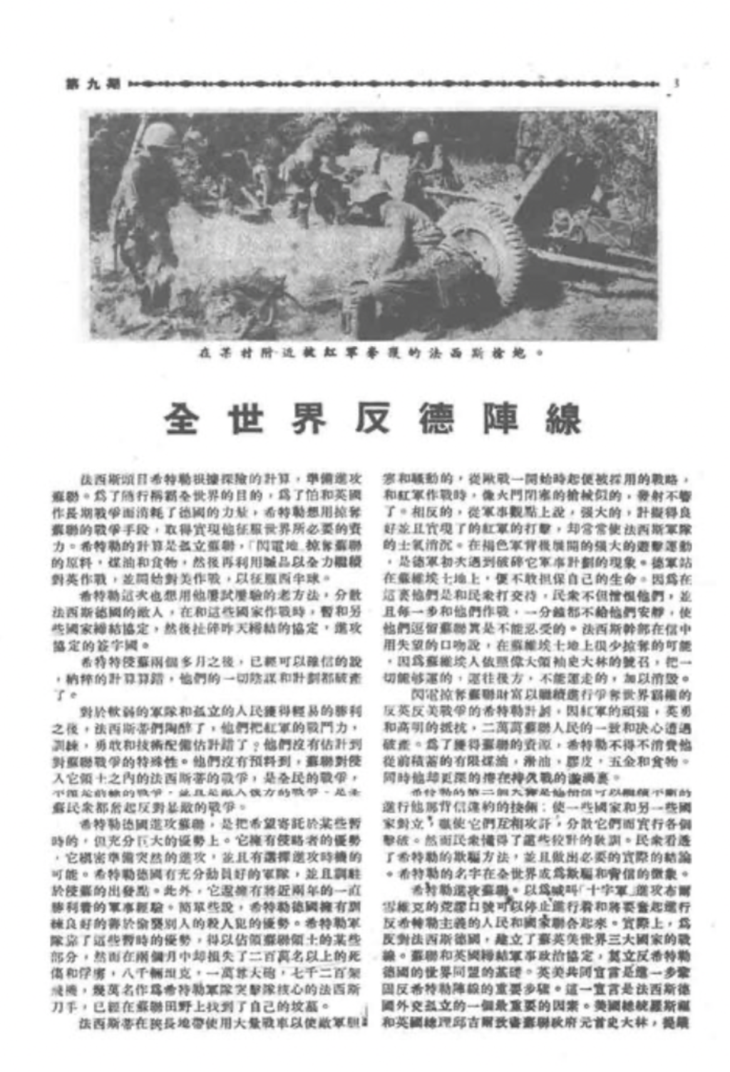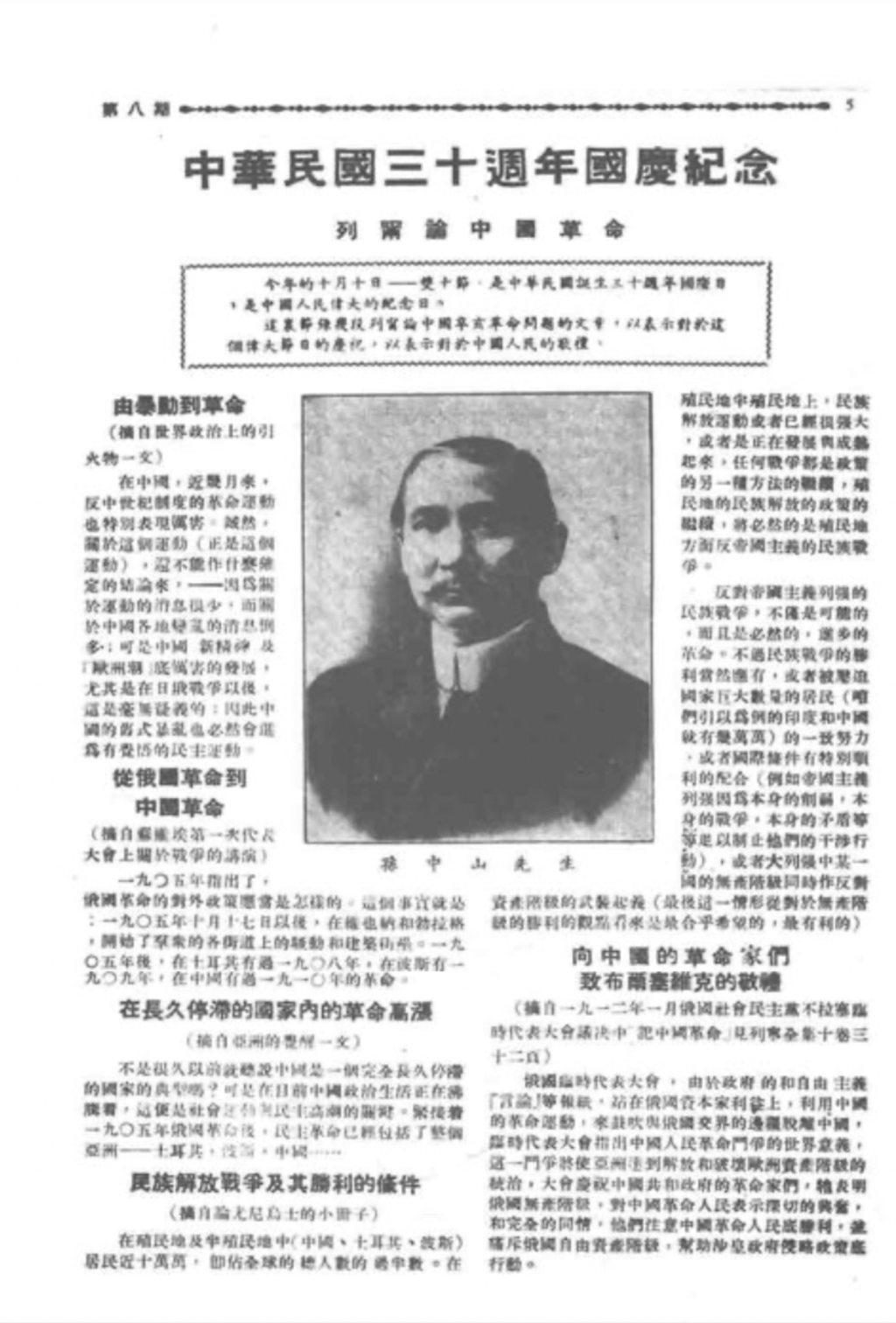 1941年10月10日,中华民国成立三十周年,《时代》杂志中文版特辟专栏,刊登了孙中山遗像,发表了“列宁论中国革命”的一组文章摘要,特别突出关于“民族解放战争及胜利的条件”,“反对帝国主义列强的民族战争,不仅是可能的,而且是必然的进步的革命”等内容。还摘编了列宁“向中国的革命家们致布尔什维克的敬礼”的指示,给处在黑暗中进行艰苦抗战的上海人民以巨大鼓舞。在苏联“十月革命”二十四周年纪念时,《时代》杂志中文版发表了郭沫若从重庆,柳亚子、茅盾、邹韬奋等知名人士从香港发来的贺电,表达了中苏人民团结一致,“全世界反法西斯侵略的斗争”必将胜利结束的美好愿望。《时代》杂志中文版还发表了大量介绍和评述苏联人民在敌后开展游击战争的情况,强调了游击队在反法西斯斗争中的战略意义。刊物在日伪*息、实行血腥统治的上海以及整个东南沦陷区,将真实情况报道给了中国民众。