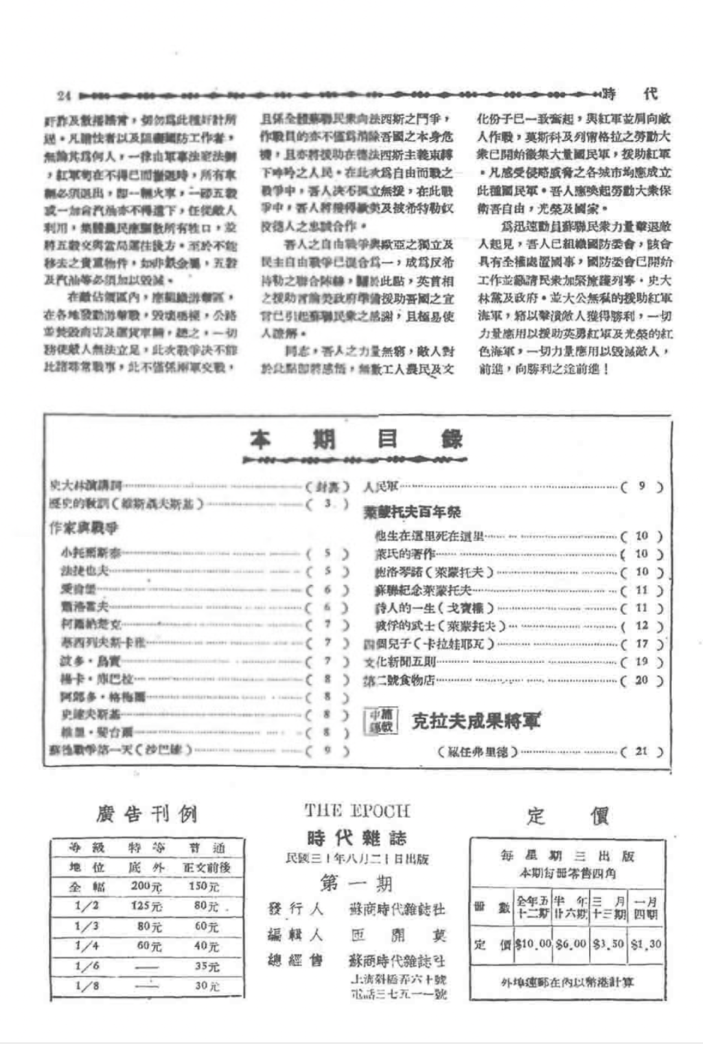 双方研究决定,由罗果夫提供材料,把俄文《时代》杂志上的一部分比较好的文章交给中方,另外塔斯社有些电讯让中方选用。《时代》杂志的编法与众不同。之一,横排,那时社会上还没有横排的杂志;第二,目录放在最后一页,这是苏联人的传统,国内书刊一般目录是放在前面的。这在形式上一新耳目。另外,杂志还会介绍苏联 *** ,提到列宁、斯大林的名字,用他们的相片,有时要用镰刀斧子、五角星作题花,这也是所有上海的刊物不曾有过的。