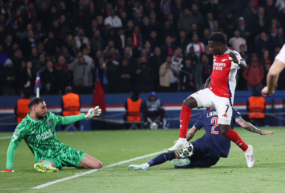 5月7日,阿森纳队球员萨卡(上)在比赛中射门得分。新华社记者 高静 摄