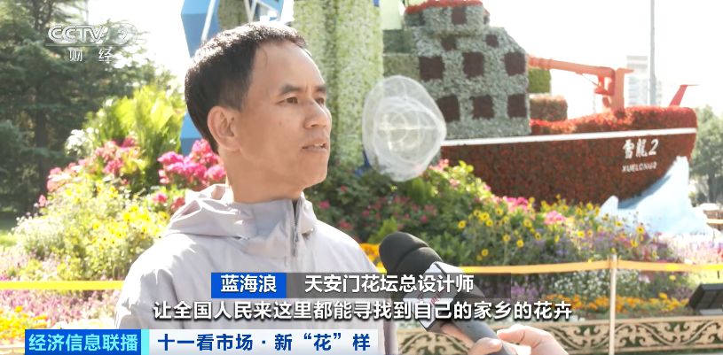 天安门花坛总设计师 蓝海浪:像英雄花、木棉花也首次在花篮里使用。同时,这个花卉我们在选择上也考虑到祖国从南到北,让全国人民来这里都能寻找到自己的家乡的花卉,寻找到自己喜欢的花。