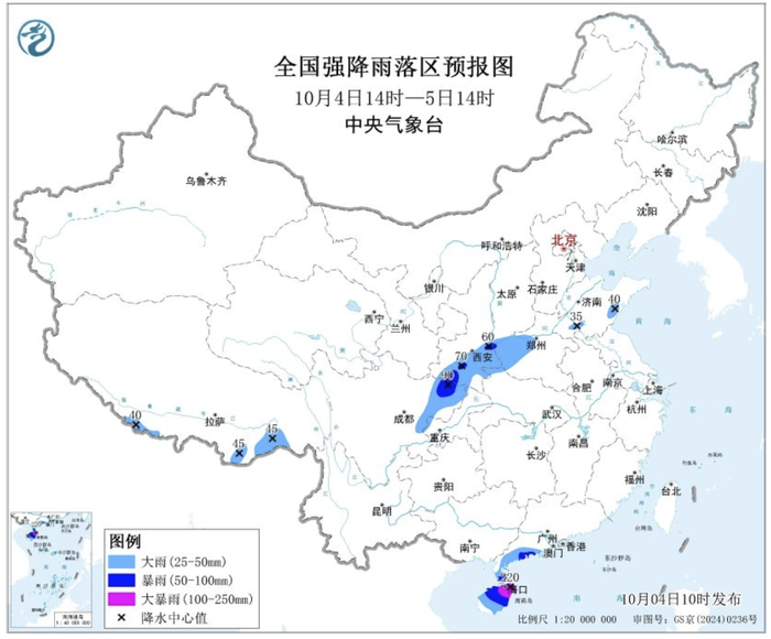 中央气象台10月4日10时发布暴雨蓝色预警:预计,10月4日14时至5日14时,海南岛中北部、广东西南部、*东南部以及四川盆地东部、陕西南部、河南西北部等地部分地区有大到暴雨,其中,海南岛东北部局地有大暴雨(100~220毫米);上述部分地区伴有短时强降水,更大小时降雨量20~40毫米,华南局地可超过80毫米。