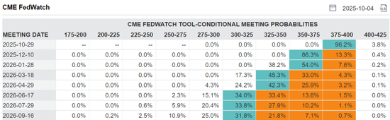 据CME“美联储观察”,截至北京时间10月4日06:30,美联储10月维持利率不变的概率为5.4%,降息25个基点的概率为94.6%;美联储12月维持利率不变概率为0.6%,累计降息25个基点的概率为15.4%,累计降息50个基点的概率为84.0%。