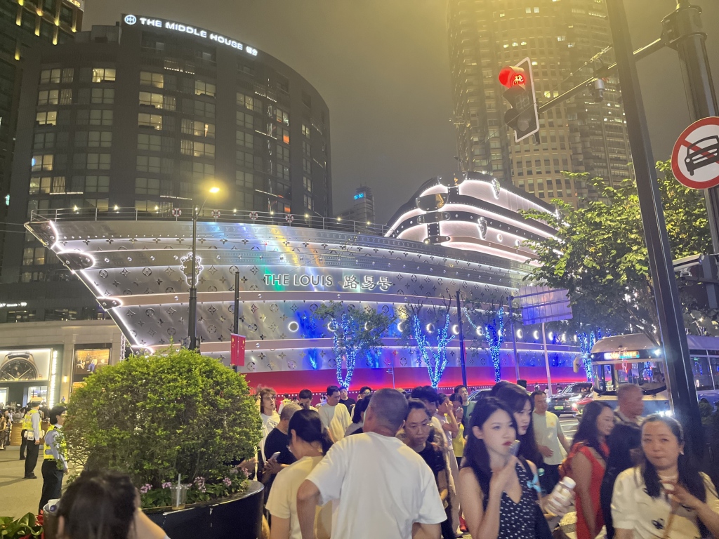10月3日晚,成都游客罗先生夫妇从13号线11号口出站,“路易号”巨轮在附近静静矗立。在巨轮前拍照打卡完,罗先生夫妇往西走,一头扎进了人声鼎沸的吴江路。