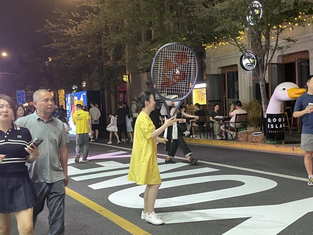 “这种体验很新奇。有点像我们小时候看露天电影,但是体育赛事比电影 *** 多了,而且在‘第二现场’要自在得多。”游客叶先生说,自己是逛到这里,才发现有赛事直播的,而且百米街区就像一个开放式的网球快闪体验场。现场可以拿着巨大的网球拍拍照打卡,马路中间设置了 “灵敏大测试”、“PERCEPT挑战”、“网球幸运咖”等互动装置,每一个他都玩了一遍。“差不多耗掉了两个多小时。虽然是计划之外的行程,但是假期嘛,就应该浪费在这种看起来没用,但是让人觉得舒服的事情上。”叶先生说道。