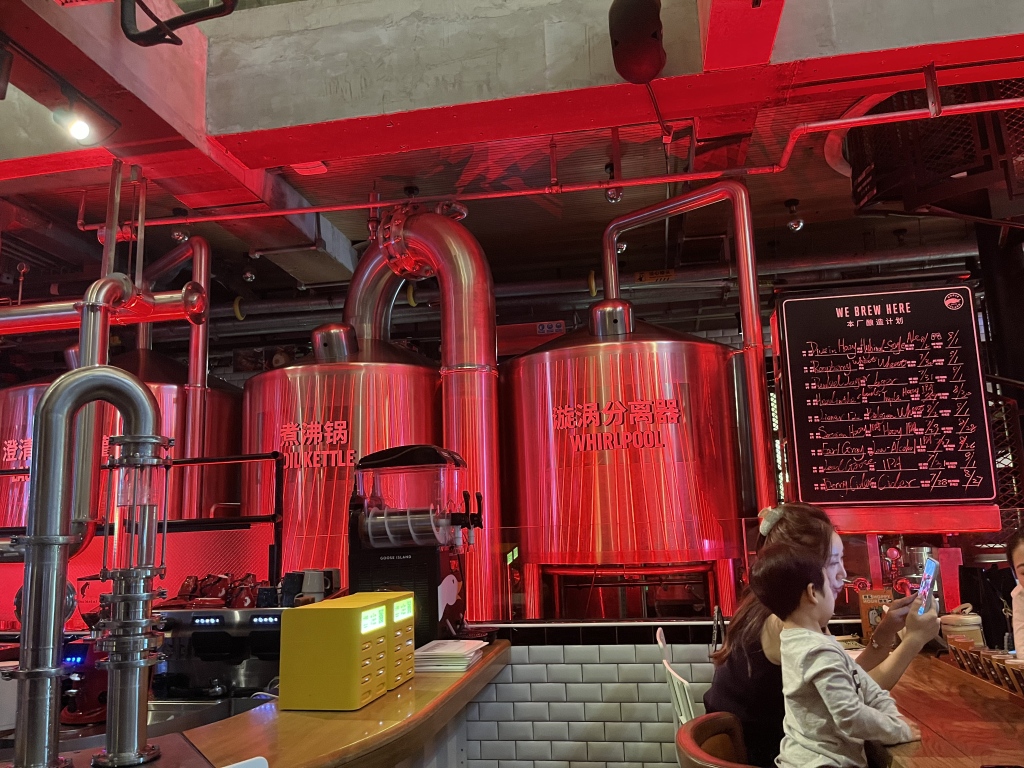 沿街的鹅岛精酿啤酒酿造工坊餐厅,这时候迎来了一天中最忙碌的时候。“国庆每天人都很多,我们基本都要营业到次日凌晨3点。”店长Simon告诉澎湃新闻记者,他们店是该品牌全国更大门店,店铺算是一半酒厂、一半餐厅,顾客喝到的,基本都是店里自己新鲜酿造出来的啤酒。两层楼空间可以容纳近200名顾客。轻松的氛围和现酿的特色,使得这家店人气长盛不衰。