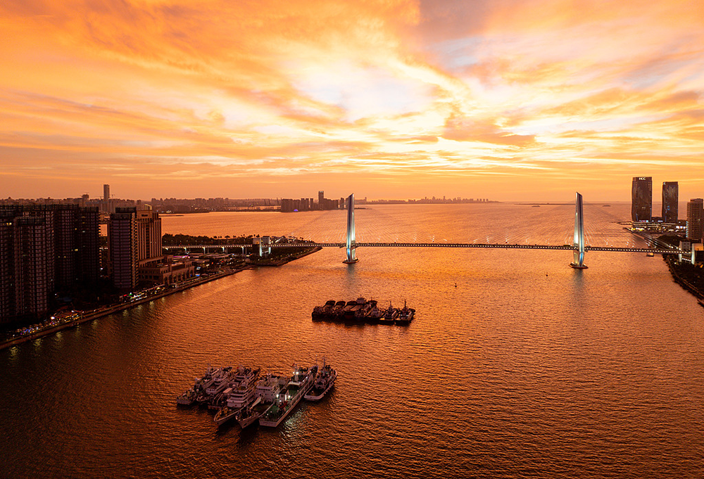 2025年10月4日傍晚,海南海口,晚霞映照下的世纪大桥。中新社记者 骆云飞 摄