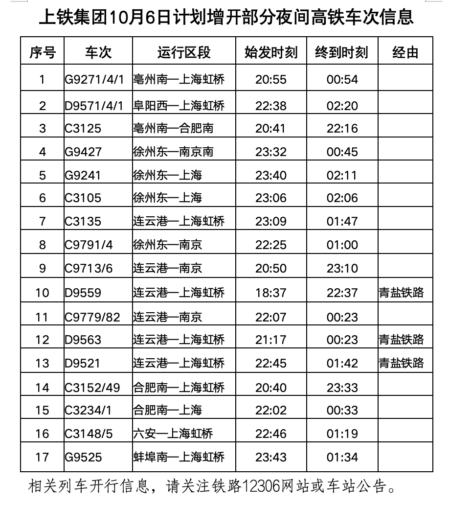 为了满足国庆中秋假期返程客流乘车需求,上铁集团在10月7日、8日增开夜间高铁列车的基础上,于10月6日计划增开17趟夜间高铁,重点补充阜阳、亳州至上海、合肥,徐州、连云港至上海、南京,合肥、蚌埠至上海等热门方向的运力。相关列车开行信息,请关注铁路12306网站或车站公告。