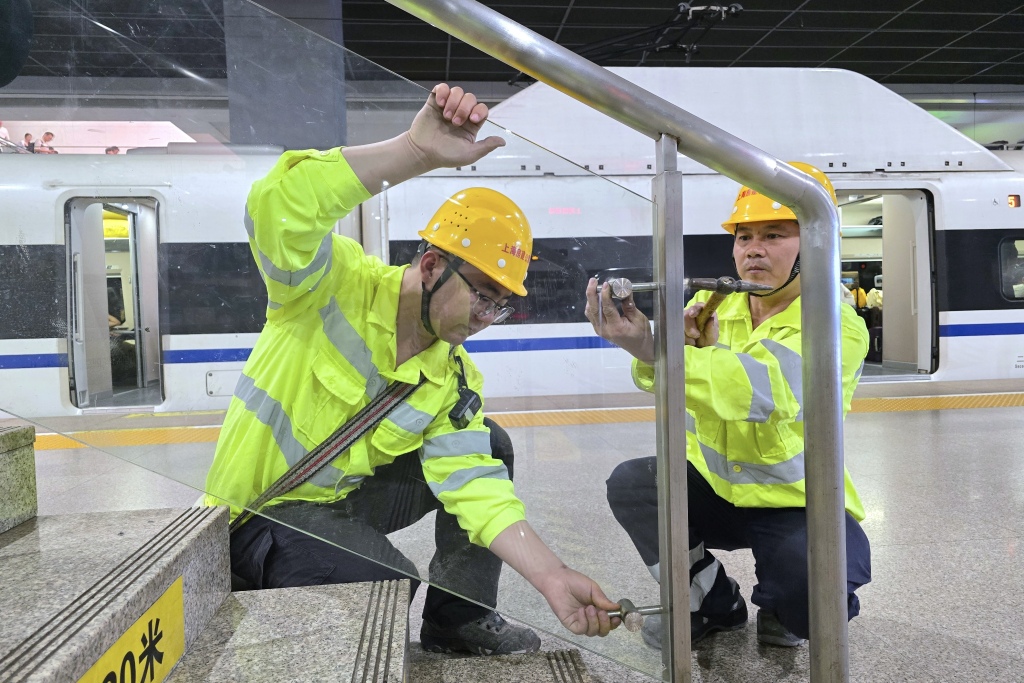 上海房建公寓段巡检工对上海虹桥站楼梯栏杆玻璃进行维修固定。 江文浩 摄