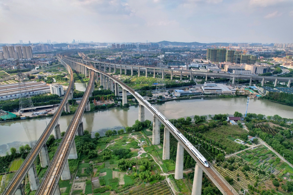 一列动车组列车行驶在浙江省绍兴市境内的线路上。 周围 摄