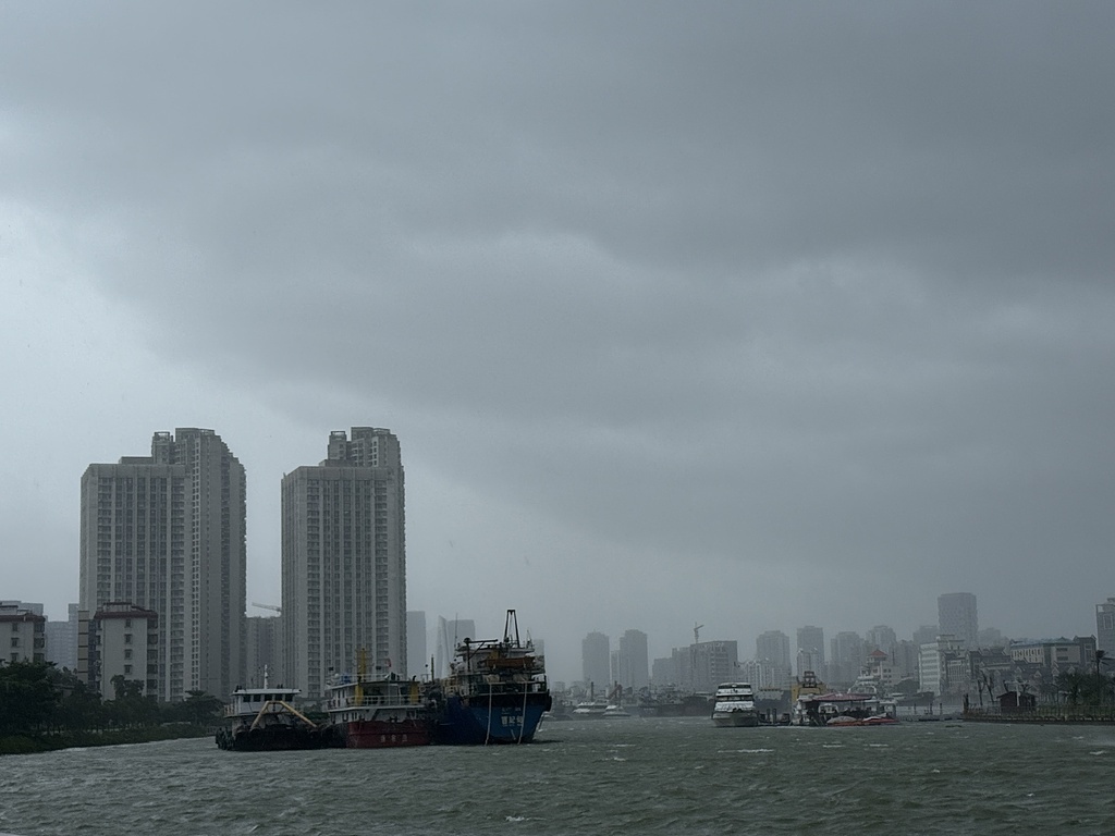 2025年10月5日,台风“麦德姆”登陆,海南省海口市狂风大作,开始下暴雨。港口的船舶移到内海避险,海口钟楼附近堤岸水位上涨。视觉中国 图