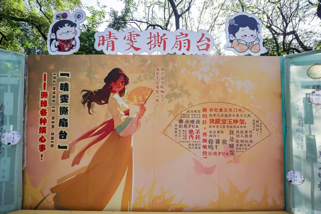艺术节把黄叶村变成“红迷嘉年华”的沉浸式剧场。红楼经典角色NPC会空降现场,游客也将带着现代人的快乐与烦恼穿越回《红楼梦》中的世界,“晴雯撕扇台”邀请大家释放现代压力,撕掉写着烦恼(如“KPI重压”“无效加班”)的扇子,在裂帛声中体验一把“千金难买一笑”的纵情任性;