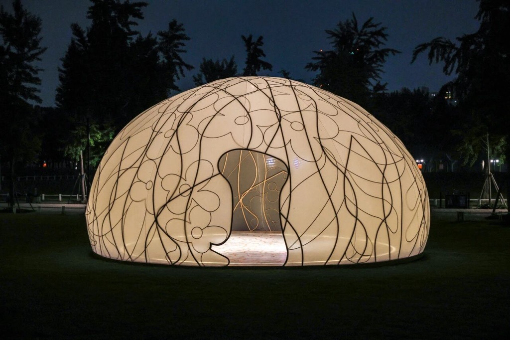 在世纪公园半月形草坪上,HCCH合尘建筑打造的《月桂》展亭,将藤蔓般的金属网架与轻盈织物编织成一轮半透的圆月。崇明“灶花”非遗传承人张伦现场绘制的桂花纹样,则在草地和展亭间生长,仿佛时光镜子里的花影流转。