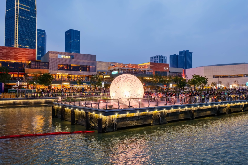 在徐汇西岸梦中心的亲水平台上,“是所SHISUO”与徐汇枫林“上海剪纸”非遗传承人石勤玲合作的《月满》展亭,以亚克力重构剪纸的玉兔群像。兔子们跳跃、回望、追逐,仿佛从敦煌壁画的“三兔图”中奔腾而出。夜幕降临时,漫步西岸梦中心滨水区域,天上的月,水中的月,岸上的月遥相呼应,游客移步换景,每走一步看到的月亮都不尽相同。