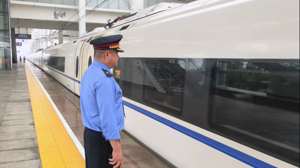 客运员目送旅客列车驶离