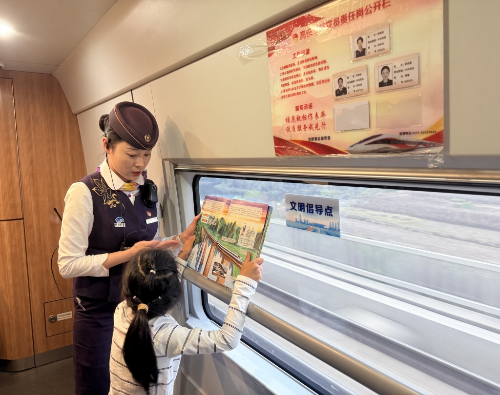 列车乘务人员向儿童宣传文明出行须知