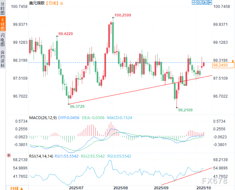技术分析美元指数整体动能倾向乐观。RSI在50中线水平上方,且受上行趋势线抬升效果显著,MACD位于零轴上方,预示短期多头占主导。