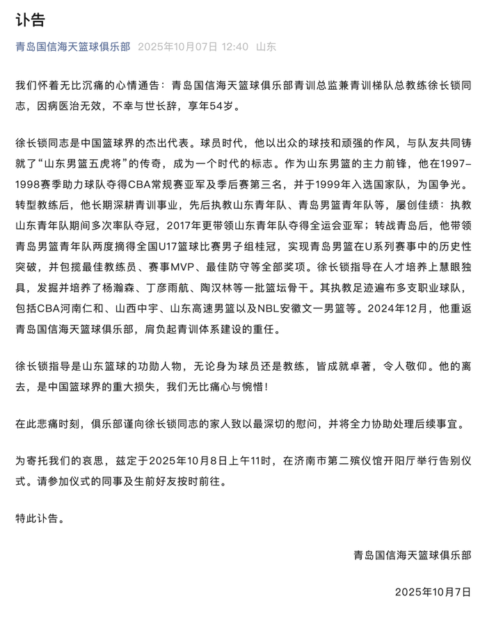 10月7日,青岛国信海天篮球俱乐部发布讣告:俱乐部青训总监兼青训梯队总教练徐长锁同志,因病医治无效,不幸与世长辞,享年54岁。在此悲痛时刻,俱乐部谨向徐长锁同志的家人致以最深切的慰问,并将全力协助处理后续事宜。