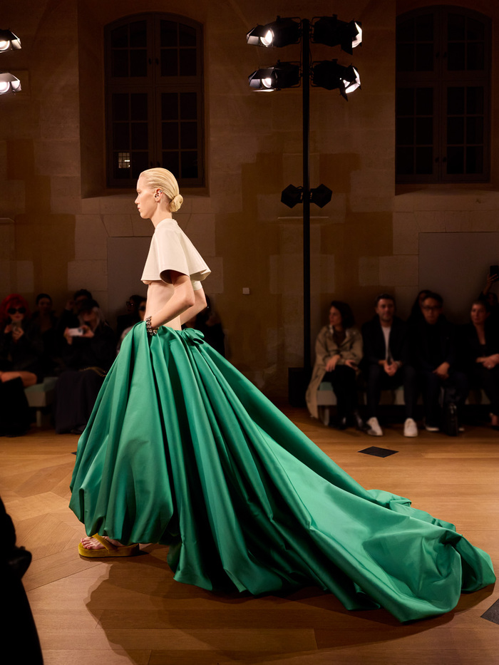 Pierpaolo Piccioli与Cristóbal Balenciaga设计语言的对话亮点就在于,他不仅传承了Cristóbal Balenciaga对于雕塑般廓形的匠心打磨,将高定工艺延伸至成衣设计中,还对Gazar丝绸做了更进一步的创新。