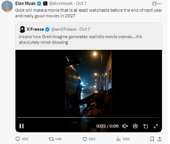 马斯克在回应一位X用户分享的Grok Imagine生成的一段电影画面时表示:“Grok在明年年底前会 *** 出一部至少可以观看的电影,2027年 *** 出一部真正的好电影。”