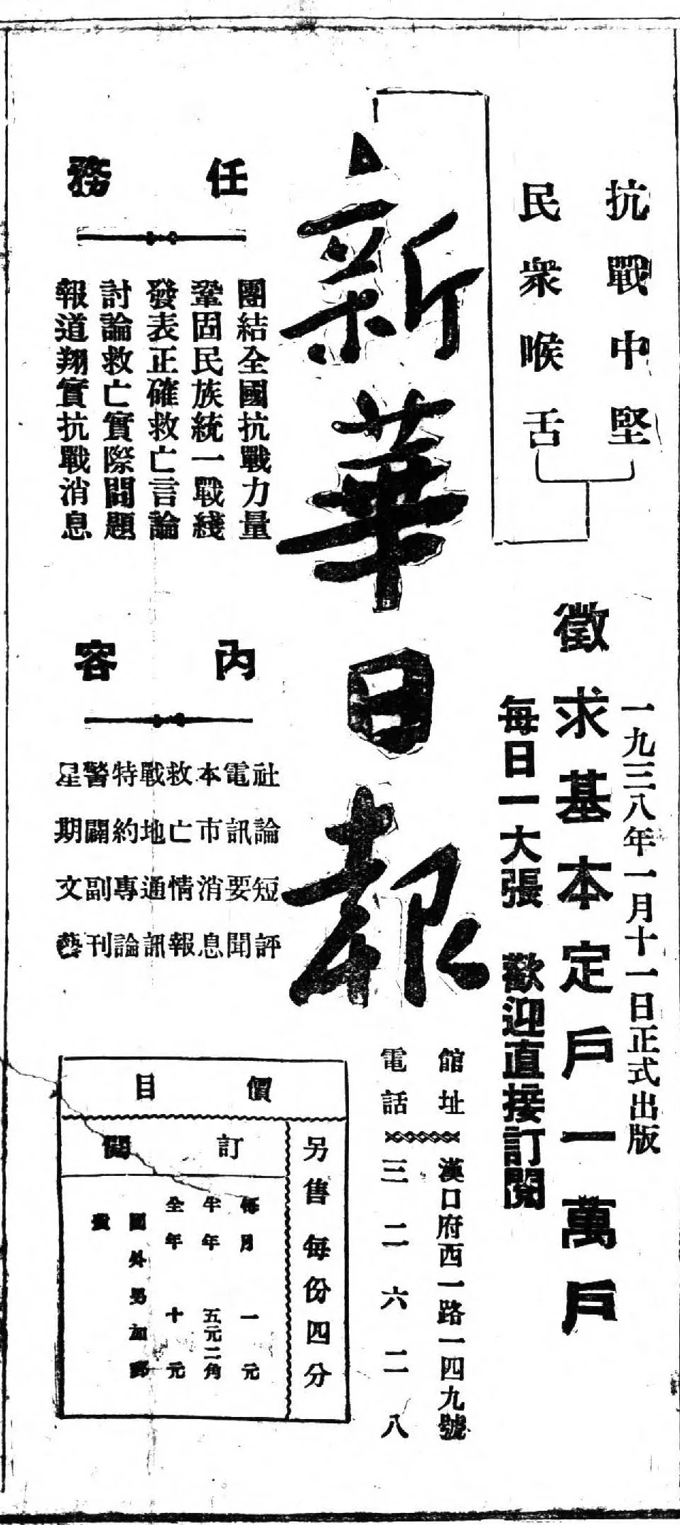 《武汉日报》1938年1月11日之一版《新华日报》的广告