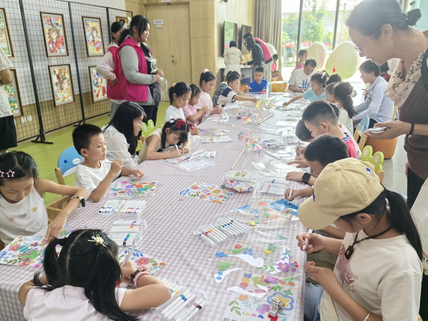一层少儿区的 “大国少年 未来有我”少儿视觉艺术展同样是孩子们的“专属天地”。一幅幅充满童真与想象力的画作,展现着孩子们眼中的祖国与未来,不少家庭驻足观赏,并参与美育体验活动,家长与孩子一起画画、做手工,现场充满欢声笑语,成为假期里温馨的亲子时光。