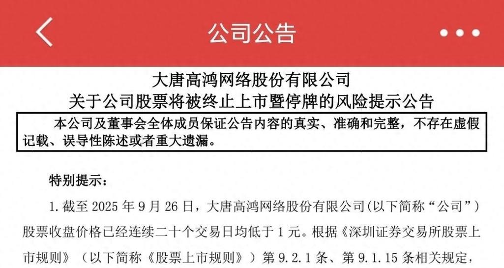*ST高鸿10月8日公告称,公司于2025年9月30日收到深圳证券交易所下发的《终止上市事先告知书》,因公司股票在2025年9月1日至9月26日期间连续二十个交易日的收盘价均低于1元,触及股票终止上市情形。公司有权在收到告知书之日起五个交易日内申请听证,或在十个交易日内提交书面陈述和申辩。若深交所最终决定公司股票终止上市,公司股票将转入退市板块挂牌 *** 。