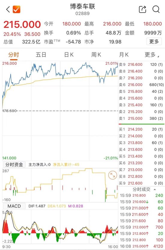 10月8日,博泰车联早盘高开,开盘涨0.84%,报180港元/股,随后延续涨势,截至收盘,博泰车联涨20.45%,报215.0港元/股,总市值达322.5亿港元。上市5个交易日,博泰车联累计涨110.31%。