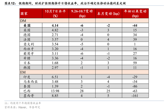 财政扩张预期推升日债收益率,政治不确定性推动法债收益率上升,法德利差走阔至年内高点。美国 *** 关门部分推动避险情绪升温,叠加降息预期边际上升,十一期间,2y、10y美债收益率均下行6bp至3.57%、4.14%。同时,由于高市早苗主张较为积极的财政政策,在名义增长或有扩张、潜在通胀上行的情况下,日债长端特别是超长端收益率上行,10y日债收益率上行2bp至1.68%,30y日债收益率上行12bp至3.28%。此外,法国财政立场偏向谨慎的中间派 *** 迅速下台,政坛更迭频繁,导致市场对法国 *** 与财政纪律信心下降,10y法债收益率十一期间持平于3.57%,但10月6日当日上行6bp,而欧元区基准的10y德债收益率则在十一期间下行4bp至2.71%,法德利差扩大至86bp的年内高位(图表12)。