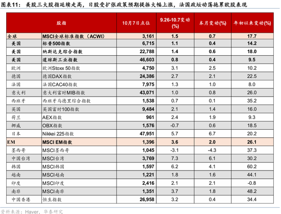 AI热潮仍支撑美股三大股指走高,财政扩张预期推升日股创新高,法国政坛动荡部分拖累欧股表现。虽然美国 *** 关门造成动荡,并对美国经济带来短期冲击,但美股仍受AI热潮支撑下延续上涨。十一期间, Open AI与AMD达成合作协议,OpenAI 承诺在未来几年购买价值 6千兆瓦的 AMD 芯片,虽然具体成本尚未公布,但AMD总裁苏姿丰表示每千兆瓦算力的成本高达数百亿美元,推动AI算力需求进一步升温[10]。具体而言,标普500、纳指、道指分别上行1.1%、1.4%、0.8%。高市早苗当选自民党总裁,并大概率于10月中旬接任日本首相,其潜在的财政与货币政策双宽松预期提振日股。日经225在十一期间上涨5.7%,其中仅10月6日就上涨4.8%。法国总理组阁不到一天便宣布辞职,法国政坛动荡拖累欧股表现。虽然十一期间,欧元区Stoxx50、德国DAX、法国CAC40指数分别上涨3.1%、2.7%、1.3%,但10月6日法国政坛动荡导致当日CAC40指数下跌1.4%,拖累整体表现。此外,新兴市场国家与地区中,韩国、中国台湾、中国香港股市也受美股AI投资溢出效应提振,MSCI韩国指数、MSCI中国台湾指数、恒生指数分别上涨6.2%、7.3%、3.2%(图表11)。