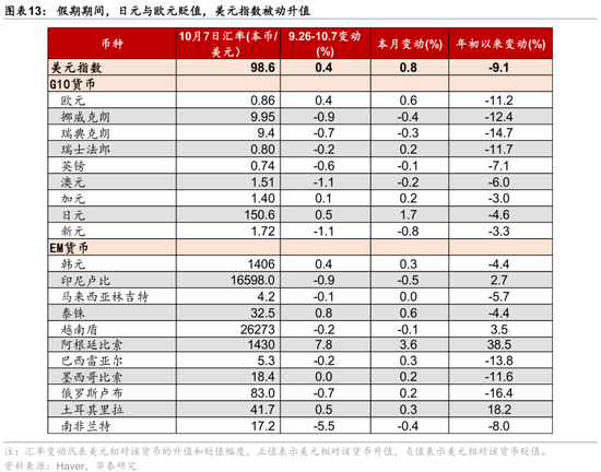 *** 关门冲击下美元指数先行走弱,但政治事件导致日元与欧元同日下跌,美元随后“被动”升值。受 *** 关门影响以及9月ADP就业大幅不及预期影响,美元一度于10月1日下跌0.4%至97.4,但随着 *** 关门事件对市场扰动边际降温,美元逐步上行。10月6日,受高市早苗当选自民党总裁后日央行加息预期延后影响,日元明显贬值,美元兑日元走强1.8%。同日,由于作为欧元区第二大经济体的法国政坛动荡,欧元短期受到拖累,欧元兑美元贬值0.3%。在主要对手货币大幅走弱的背景下,美元指数于10月6日上涨0.4%。整体来看,十一假期期间美日欧货币表现分化,美元指数上涨0.4%至98.6,日元与欧元分别贬值0.4%、0.5%至150.6、1.17(图表13)。