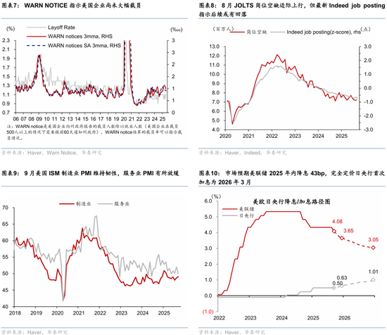 *** 关门导致9月非农等经济数据被推迟公布,广谱就业数据显示美国就业市场延续放缓,但仍未失速。广谱就业数据上,9月ADP新增就业超预期收缩,但8月JOLTs岗位空缺有所上行、9月挑战者裁员人数回落,高频数据WARN、Indeed也指示美国企业仅暂缓 *** 但尚未大幅裁员。