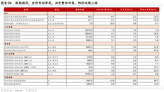以G3为代表的法币公信力下降,支撑“类货币资产”的黄金价格再创新高,油价先跌后涨,铜价延续上涨。多重政治事件冲击下,G3法币公信力下降,支撑金价再创新高,COMEX黄金期货上涨5.1%至4004美元/盎司。美国原油库存增加、OPEC+延续增产、伊拉克-土耳其原油管道重启以及加沙冲突存在降温可能等多重因素推动下,国际油价整体回落,但OPEC+增产量部分不及预期也使得近两个交易日油价有所回升。整体来看,十一期间,布伦特原油期货价格回落6.7%至65.5美元/桶。同期,具有AI商品属性的铜延续上涨,且供应紧张短期对价格仍有支撑,LME铜期货上涨5.1%至10643美元/吨(图表14)。