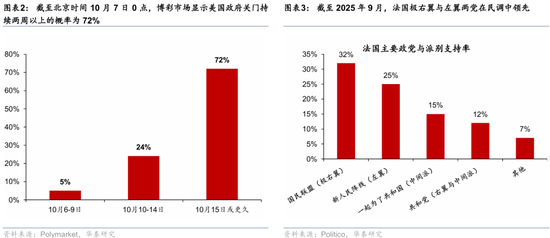 10月1日美国 *** 如期关门,且两党立场较为强硬,关门时间或超过两周。北京时间10月1日中午十二点,由于两党在医疗补助削减问题(ePTC延期)上存在分歧,无法通过拨款或短期融资法案,美国 *** 暂时关门(参见《美国 *** 如期关门,后续如何?》,2025/10/2)。永久延长增强型保费税收抵免(ePTC)将导致2026财年新增赤字234亿美元。根据CBO于9月30日的测算,永久延长于2025年底到期的ePTC将导致美国未来十年合计新增赤字3500亿美元,其中2026财年新增赤字234亿美元,占2026财年GDP比例为0.07%[1],后续将呈现逐步上升趋势(图表1)。截至10月7日两党尚未表现出明显妥协意愿,仍维持强硬立场,导致关门或持续两周以上。虽然一般情况下, *** 关门能够促成两党在两周内达成协议,但两党或均认为本次 *** 关门对自身博取政治资本有利,目前博彩市场预期美国 *** 关门超过两周的概率为72%,较10月1日的41%明显上升(图表2)。10月7日,特朗普表示愿意就平价医疗法案补贴达成妥协;如果能够落地则有助于结束 *** 关门。 *** 关门对经济存在短期冲击,通常没有长期影响;经济数据发布将有所延迟。 *** 关门期间, *** 雇员停薪导致其收入与开支下降、 *** 将暂停购买商品与服务。复盘1970s以来的 *** 关门经验,平均来看,关门一周对当季GDP季环比增速的拖累约为0.1pp左右,但会在后续季度回补(参见《美国 *** 再度面临暂时关门风险》,2023/9/26)。白宫经济顾问委员会主任哈塞特则于6日表示,若总统认为短期无法与民主党达成协议结束关门,便会采取裁员措施[2]。但目前裁员仍然只是共和党和特朗普的威胁手段,并没有明确信息表明裁员行动开始。此外,由于BLS、BEA等部门的经济数据统计人员并不属于 *** 关门期间“必要”岗位,因而会在关门期间暂停收集、统计与发布相关经济数据,目前已导致9月非农数据、周度首申等数据延迟公布,后续9月CPI也可能被推迟(图表4)。向前看,本次关门作为美国政治极化与财政可持续性等长期问题的短期集中显现。在美国政治极化的背景下,两党为博取自身政治资本,无关具体事务本身,妥协选项的权重或逐步下降,此类风波与风险或将在此后持续扰动市场。此外,本次关门部分印证了“大而美”法案中减支落地难度较大,且美国政治极化将 *** 关门“武器化”,长期美国财政可持续性担忧加剧。