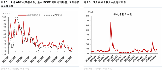 - 9月非农暂未公布,其他就业数据显示美国就业市场仍在放缓。由于美国 *** 关门9月非农报告以及周度首申数据延迟发布,其他私营部门统计数据可辅助判断美国经济走势,并对市场短期影响有所扩大。9月美国ADP私人部门新增就业-3.2万人,较8月的0.3万人的降幅进一步扩大,大幅不及预期的5万人,显示美国就业市场延续放缓(图表5);但ADP本月基于最新公布的2024年QCEW数据进行基准调整,导致9月新增就业较调整前口径下降4.3万人,或部分夸大了就业市场的风险[4]。此外,8月JOLTs岗位空缺超预期上行、9月挑战者裁员人数也有所回落,美国劳动市场或仍处于逐步放缓进程中,尚未失速。8月JOLTs岗位空缺较7月上行1.9万至722.7万,且高于预期的718.5万,而9月挑战者裁员人数较前月的8.6万人回落至5.4万人(图表6-8)。