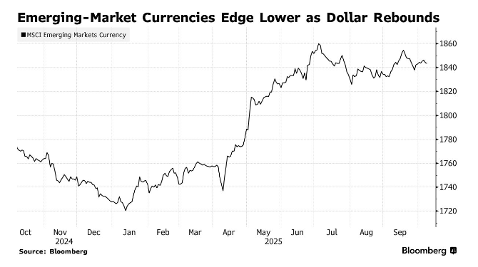 一项追踪新兴市场货币的指数当日跌幅一度达0.3%,随后跌幅收窄,最终几近持平。其中,拉丁美洲多数货币表现坚挺,抵御了大盘的跌势,而中欧和东欧货币则普遍走弱。与此同时,美元持续走高,创下自9月19日以来最长连涨纪录,黄金价格则飙升至每盎司4000美元上方。