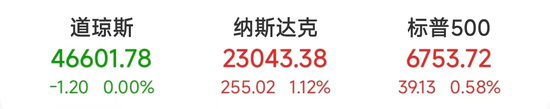 道指跌1.20点,报46601.78点;纳指涨255.02点,涨幅为1.12%,报23043.38点;标普500指数涨39.13点,涨幅为0.58%,报6753.72点。