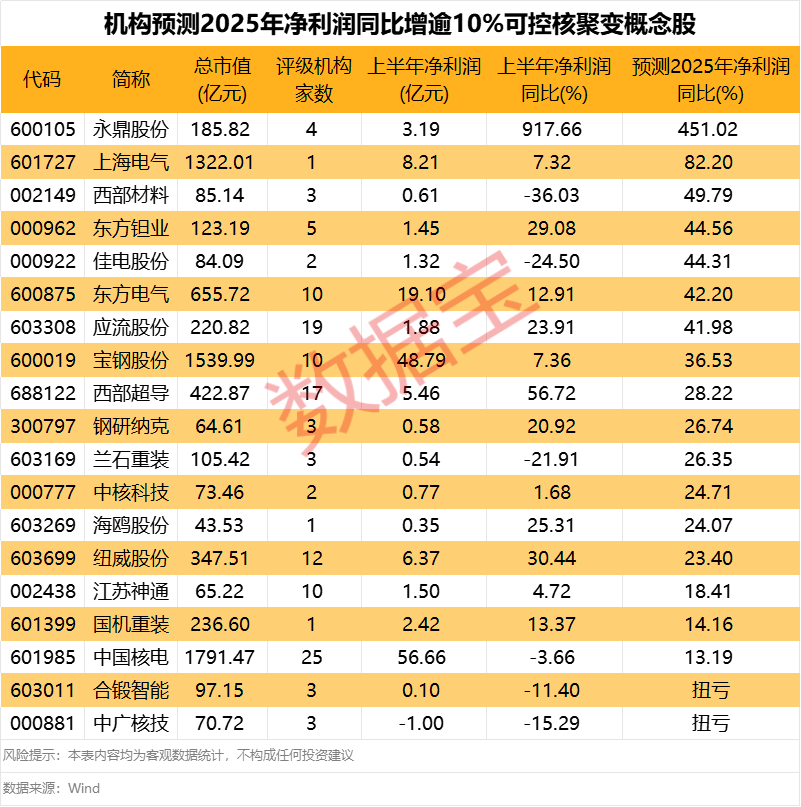 根据机构对上市公司全年盈利的预测,永鼎股份2025年净利润有望同比增长451.02%;上海电气全年净利润有望同比增长82.2%;、、、和应流股份全年净利润有望同比增长40%以上。另外,、全年净利润有望实现扭亏为盈。
