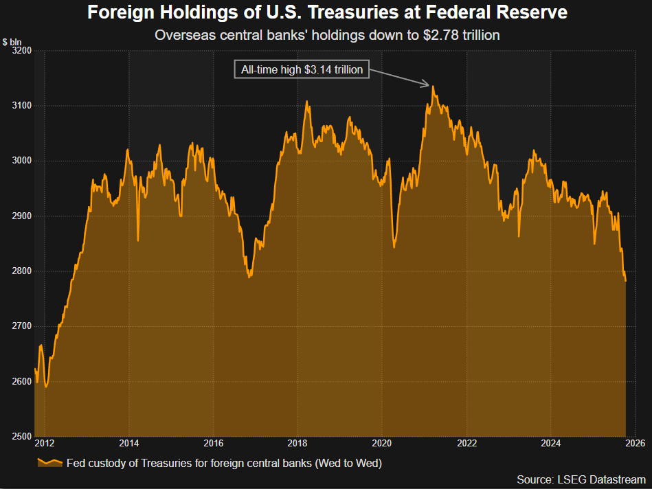 最新数据显示,由纽约联储代外国央行托管持有的美国国债价值为2.78万亿美元——这是自2012年8月以来的更低水平,并且在短短两个月内就减少了多达1300亿美元。