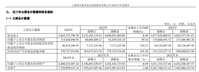 不过,妙可蓝多的利润业绩质量并不高,利润规模很大程度上依靠非经营性因素取得,2022年至2024年,妙可蓝多的归母净利润分别为1.35亿、6007万、1.136亿,但同期的扣除非经营性损益后的归母净利润分别为6913万、717万、4692万,一下子缩水不少,这说明妙可蓝多的主营业务赚钱其实很少。