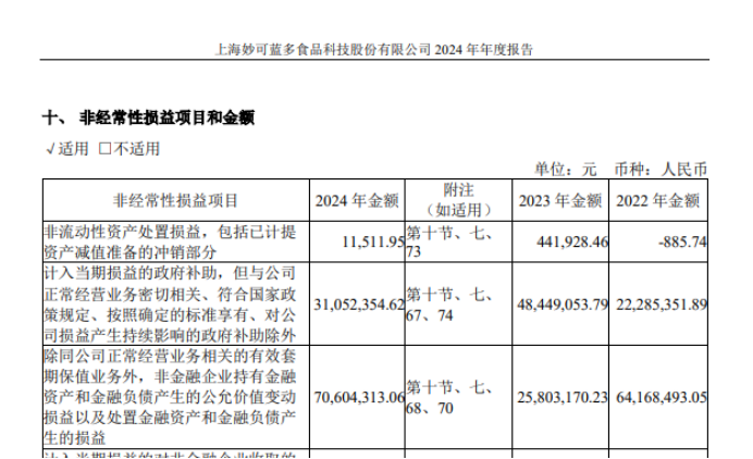 数据显示,2022年至2024年,妙可蓝多收到的计入当期损益的 *** 补助分别为2228.5万元、4844.9万元、3105万元,同期的投资收益分别为6416.8万元、2580万元、7060万元,仅这两项之和分别占当年度归母净利润的64%、123.6%、89.5%,换言之妙可蓝多的投资收益和 *** 补助构成了当年度归母净利润的绝大部分,甚至超过当年度归母净利润。这也进一步凸显了妙可蓝多的主营业务业绩质量并不好。
