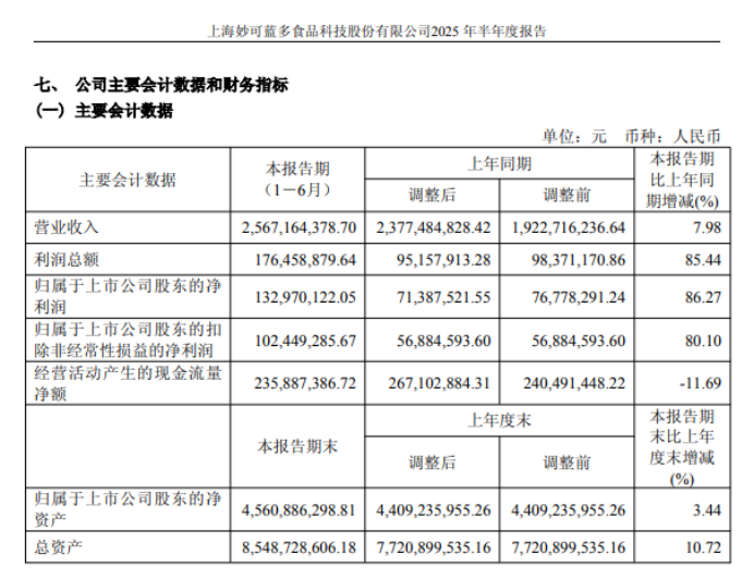 到了今年上半年,这种情况仍然没有改善。2025年1-6月,妙可蓝多营收25.67亿元,同比增加7.98%,归母净利润1.329亿元,不过扣非后的归母净利润降至1.02亿元。当期的投资收益和 *** 补助仍然高达3694万元。