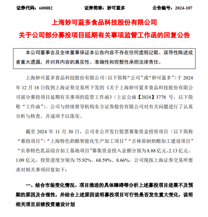 更有意思的是,这笔定增本来打算投资的“上海特色奶酪智能化生产加工项目”、“吉林原制奶酪加工建设项目”、“长春特色乳品综合加工基地项目”等三个项目进度大幅低于原计划,在2024年年底还引来了交易所的问询函。