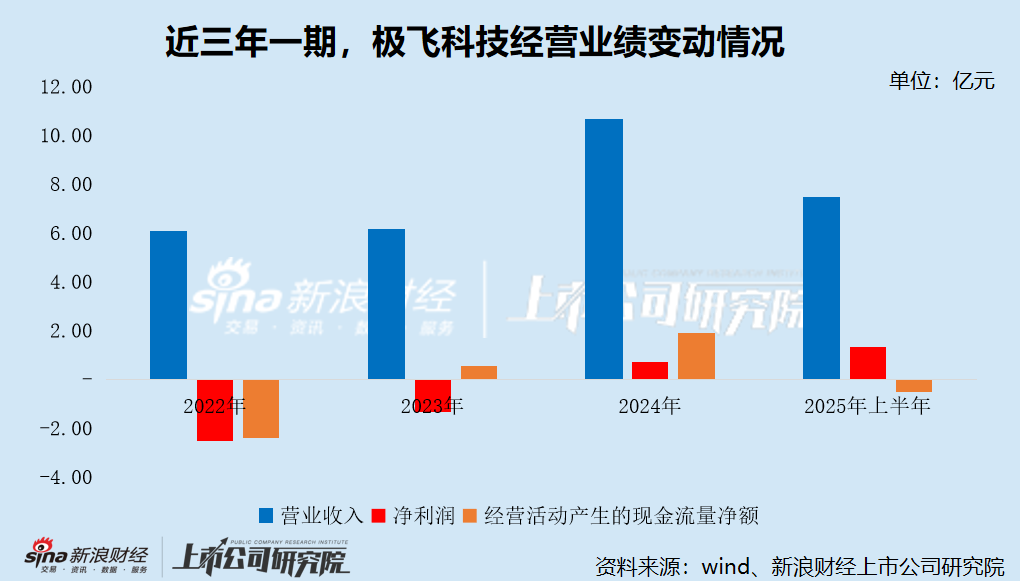 经营业绩层面,报告期内,极飞科技的总收入分别为6.05亿元、6.14亿元、10.66亿元及7.45亿元(YoY+2.08%),2022-2024年的复合增长率为32.74%;经调整净利润分别为-2.47亿元、-1.36亿元、7196.8万元及1.34亿元,于2024年实现扭亏为盈。