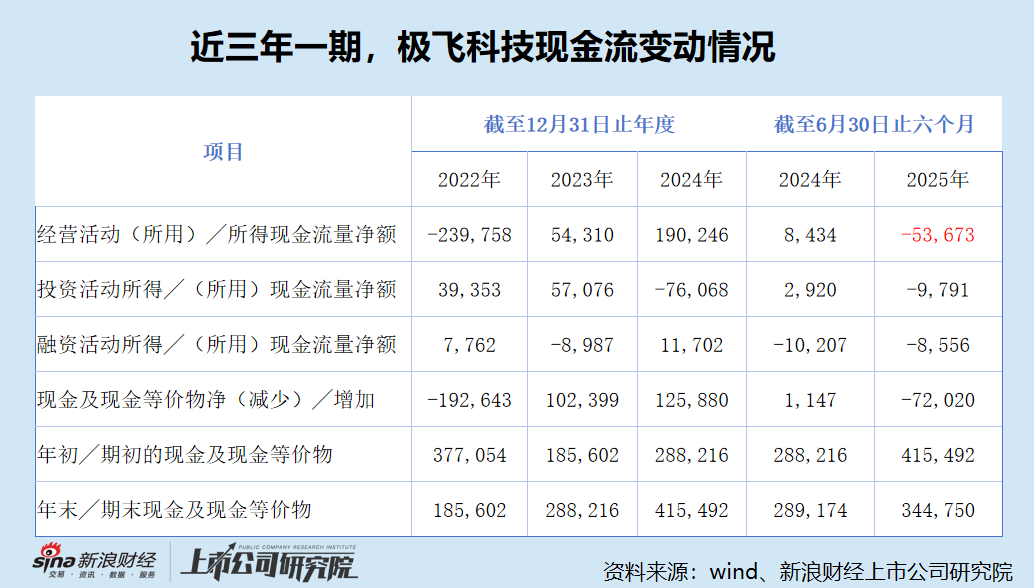 虽然净利润持续增长,但极飞科技的经营性现金却大幅下滑,同比由正转负。2025年上半年,公司的经营性现金净流出5367.3万元,上年同期为净流入843.4万元。