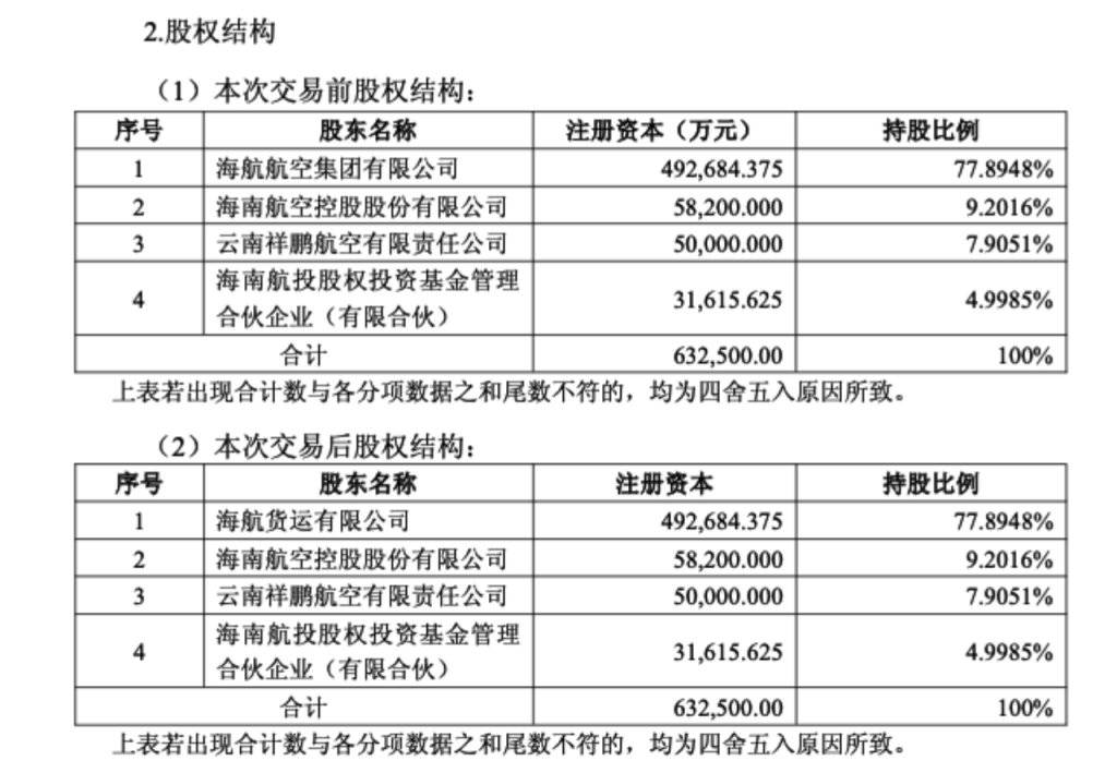 去年12月,海航控股就发布过关于放弃参股公司股权优先购买权暨关联交易的公告,称海航航空集团拟 *** 其持有的金鹏航空6.29%股权,交易金额约1.89亿元。上述股权的拟 *** 接收方为海南航投,是依托海南自贸港基金发起设立的一只航空产业子基金,成立于2024年6月10日,总募集规模10亿元。该交易完成后,海航控股、海航航空集团、祥鹏航空、海南航投将分别持有金鹏航空11.58%、72.18%、9.95%、6.29%的股权,海航控股及祥鹏航空对金鹏航空的持股比例不变。