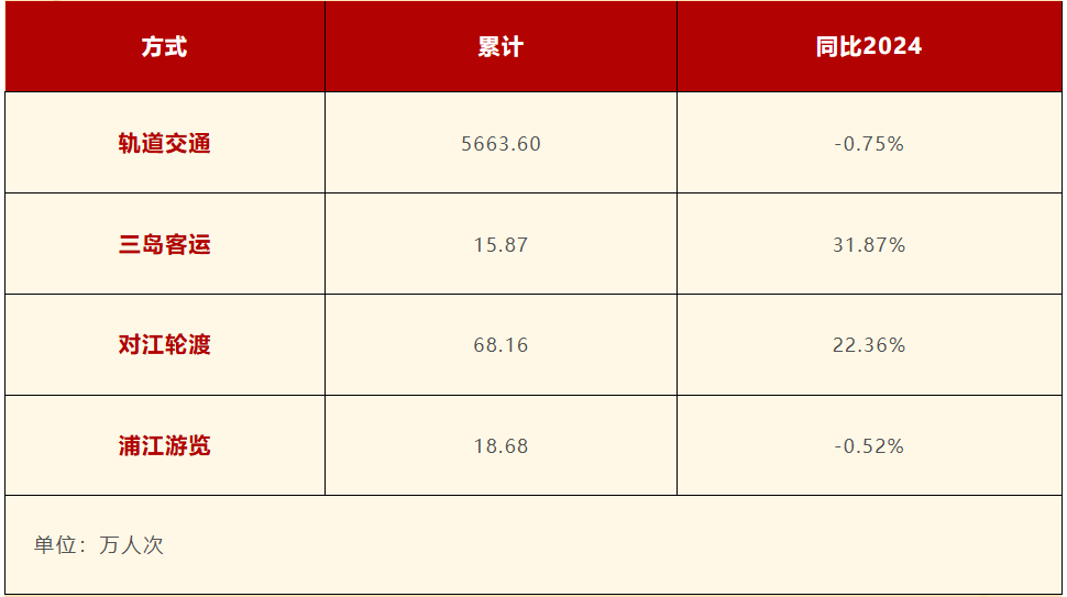 据不完全统计,中秋国庆假期,市内交通累计运送乘客5766.31万人次,日均较2024年同期下降0.46%。具体如下: